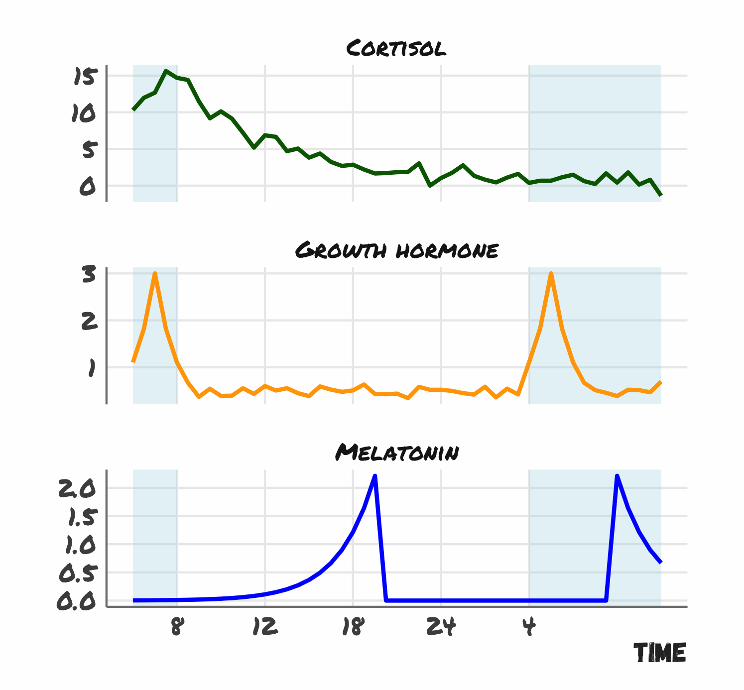 The pineal and pituitary glands secrete a number of hormones during sleep