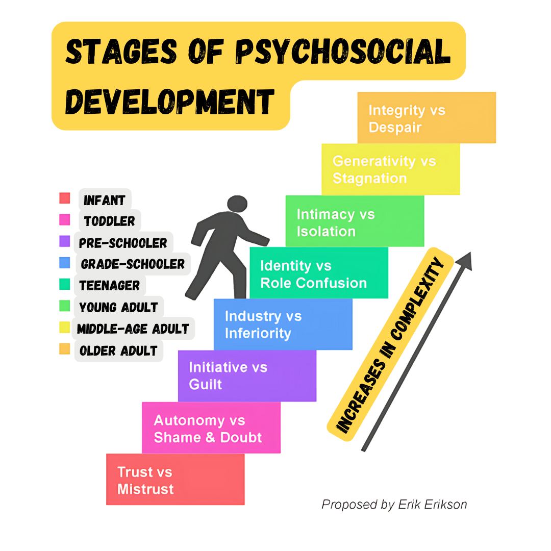 | 4 | 7-11 | Industry vs. inferiority | Develop self-confidence in abilities when competent or sense of inferiority when not |