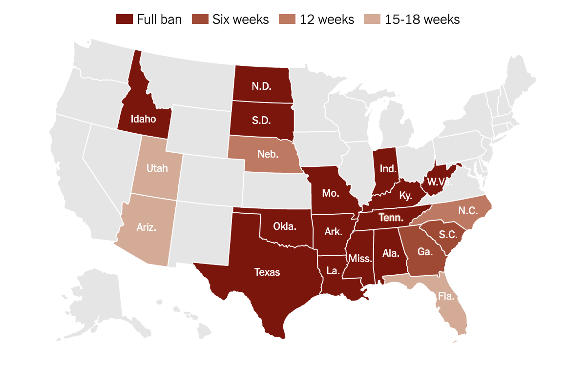 Near-total bans (13 states)