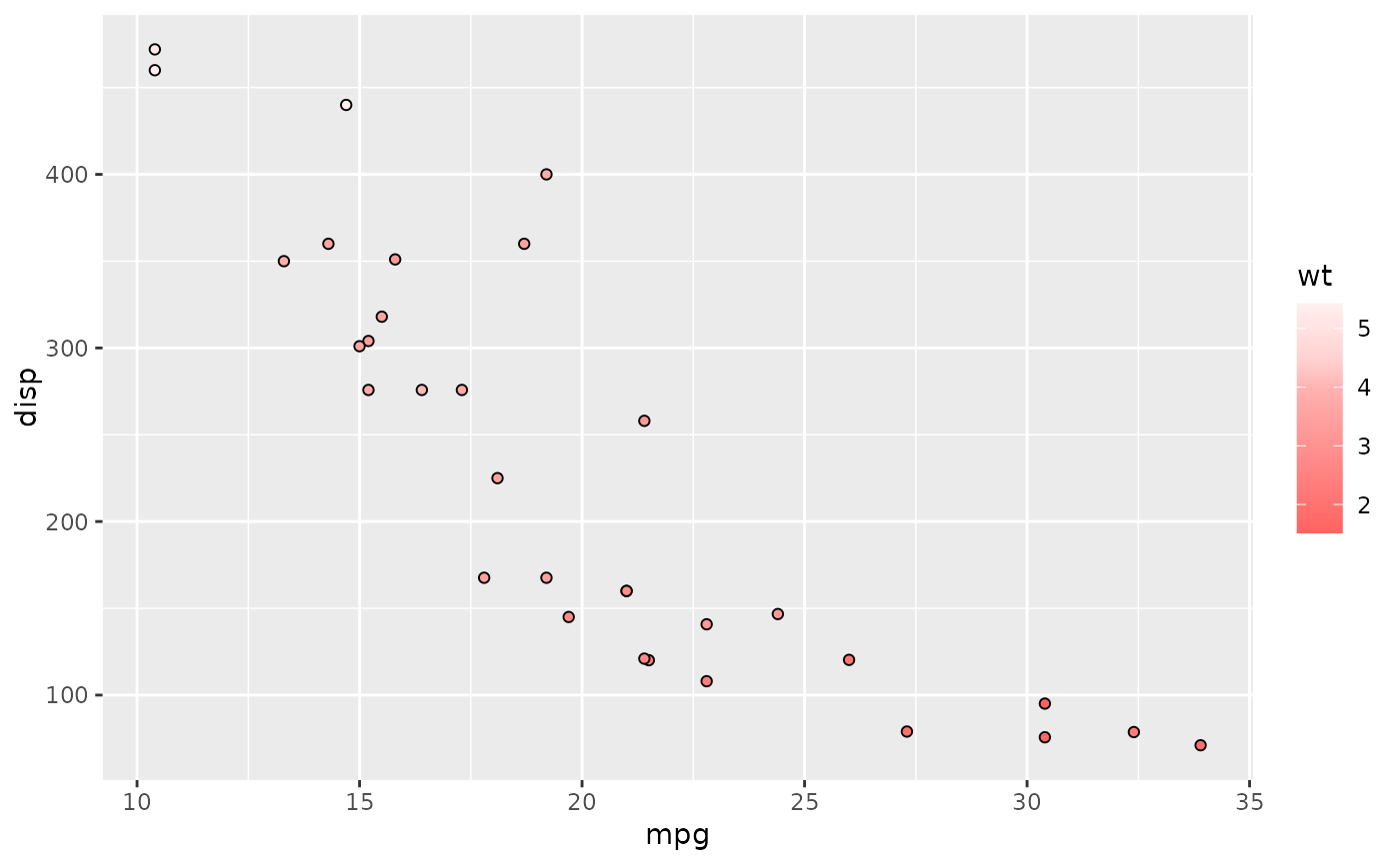ggplot(data=mtcars, aes(x=mpg, y=disp, fill=wt)) +